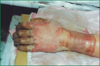 深Ⅱ度深型燒燙傷創(chuàng)面的處理: 早期按淺Ⅱ度燒燙傷創(chuàng)面的處理方法治療,5天后去掉腐皮。因真皮組織已受損,創(chuàng)面呈蠟白色,應(yīng)繼續(xù)涂藥,厚度薄于1毫米,每4小時(shí)更換一次藥膏。用藥后,可見創(chuàng)面因藥物作用而出現(xiàn)的壞死組織液化物排出,此表現(xiàn)為正常(不要誤以為是感染)。但應(yīng)注意,每次換藥前,須將創(chuàng)面上殘留的藥物及白色液化物用消毒紗布或紙巾輕輕拭去后再涂藥,大約15天后,壞死組織被液化排除,創(chuàng)面出現(xiàn)纖維隔離膜,然后繼續(xù)按上述方法治療保護(hù)纖維隔離膜,直至創(chuàng)面平皮愈合。如果治療時(shí)間超過(guò)三周,創(chuàng)面仍未愈合,表明為淺Ⅲ度創(chuàng)面,應(yīng)繼續(xù)按Ⅲ度創(chuàng)面的治療方法治療。