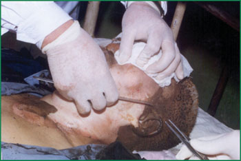 5、 傷后第18天,壞死皮膚液化排除,用紗布無損傷地吸附液化物。注意保護創(chuàng)面纖維隔離膜。