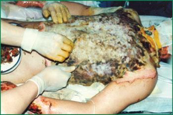 2、 對胸部Ⅲ度燒傷創(chuàng)面進行耕耘減張術(shù),敷用MEBO,采取燒傷濕潤暴露療法(MEBT)治療。