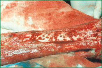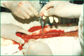 4、 用骨鉆在骨面按間隔1厘米鉆孔,鉆孔深度達髓質,有微出血。