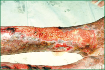 1、 小腿脛骨下段燒傷創(chuàng)面的表現(xiàn)。