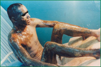 1、患者,男,34歲,硫酸燒傷,面積60%,(深Ⅱ度30%,淺Ⅲ度30%)創(chuàng)面焦痂呈黑色和棕褐色,外涂MEBO保護創(chuàng)面組織。