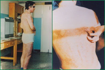 1、 患者,男,36歲,液態(tài)黃磷燒傷,面積80%(深Ⅱ度65%,Ⅲ度15%)