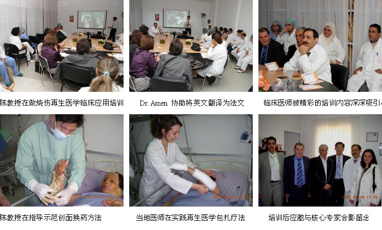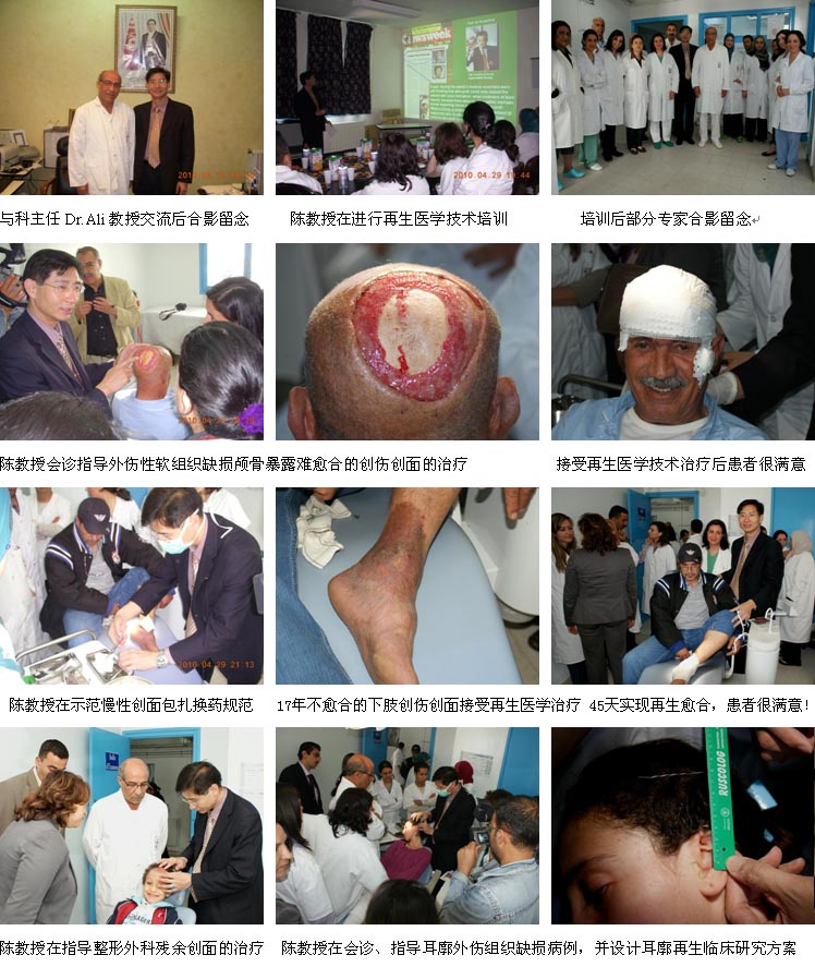 應(yīng)突尼斯整形燒傷外科學(xué)會(huì)和多家醫(yī)院的邀請(qǐng),中國燒傷創(chuàng)瘍科技中心臨床部主任、北京榮祥再生醫(yī)學(xué)研究所副所長(zhǎng)、北京中西醫(yī)結(jié)合學(xué)會(huì)燒傷專業(yè)委員會(huì)副主任委員、中國燒傷創(chuàng)瘍雜志社副社長(zhǎng)陳永翀教授于2010年4月26日至30日來到了地處非洲北部的突尼斯,參加了全國燒傷整形學(xué)術(shù)年會(huì)并到多家醫(yī)院進(jìn)行培訓(xùn)演講、學(xué)術(shù)交流、到燒傷中心示范指導(dǎo)燒傷創(chuàng)瘍病例的治療等,很受當(dāng)?shù)氐尼t(yī)師、護(hù)士和患者的歡迎。在短短的4天的時(shí)間里,成功參加了國家級(jí)學(xué)術(shù)交流會(huì)議并做主題演講,來自全國的燒傷、整形和創(chuàng)傷外科專家35人出席了會(huì)議,收到較好的學(xué)術(shù)推廣、規(guī)范臨床技術(shù)的效果;成功舉辦市級(jí)培訓(xùn)班1期,培訓(xùn)醫(yī)護(hù)人員50余名;舉辦院內(nèi)培訓(xùn)班2期,培訓(xùn)醫(yī)護(hù)人員40余名;培訓(xùn)經(jīng)銷商的醫(yī)療開發(fā)人員6名;會(huì)診、指導(dǎo)2例燒傷患者的治療和5名創(chuàng)瘍患者的治療。實(shí)現(xiàn)了較好的開發(fā)效果,現(xiàn)以圖片的方式做一個(gè)簡(jiǎn)報(bào)。