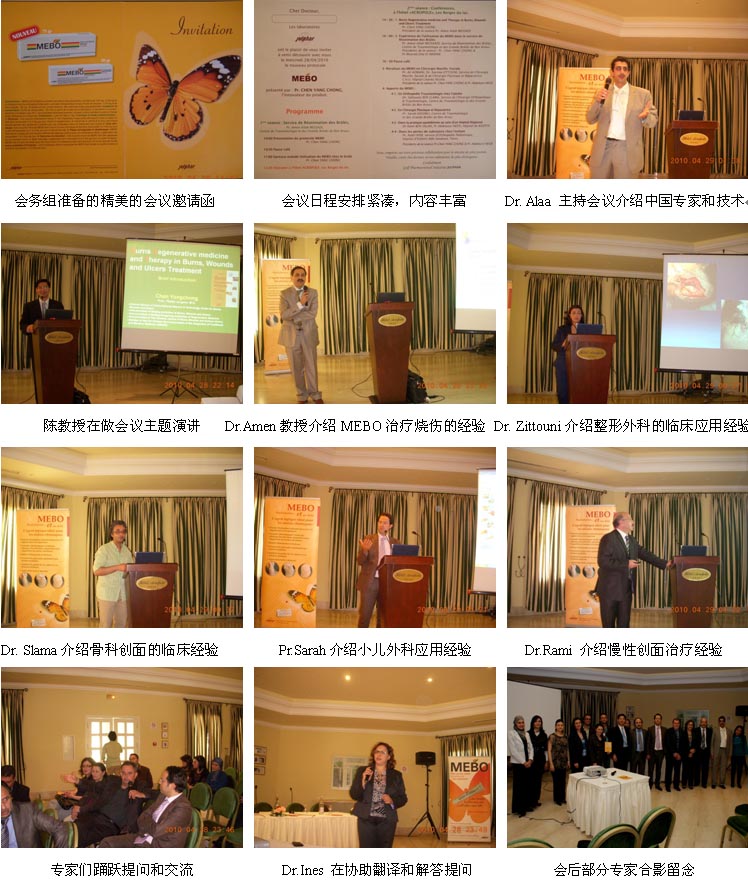 3、2010年4 月29日,突尼斯國家級(jí)燒傷、創(chuàng)傷外科學(xué)術(shù)交流會(huì)在Acropole Hotel會(huì)議室舉辦, 學(xué)術(shù)交流會(huì)有Dr.Alaa Haleil主持,來自全國3個(gè)主要城市的10多家醫(yī)院的30多名燒傷、整形、創(chuàng)傷外科醫(yī)師參加了學(xué)術(shù)交流會(huì),陳教授以“Burns Regenerative Medicine and Therapy in Burns, Wounds and Ulcers treatment” 為題做了主題演講。另外,還有6名專家教授在交流會(huì)上介紹了他們近年來應(yīng)用MEBO治療燒傷、創(chuàng)傷和潰瘍的臨床經(jīng)驗(yàn),學(xué)術(shù)氛圍濃厚,大家都覺得這是一次非常難得的交流和學(xué)習(xí)的機(jī)會(huì),希望以后每次學(xué)術(shù)年會(huì)都有新技術(shù)和好經(jīng)驗(yàn)的介紹和交流。