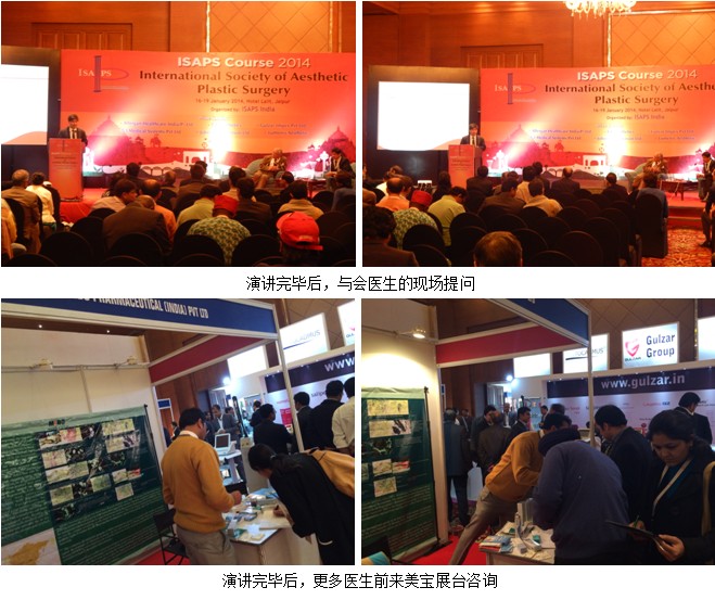 演講后,參會(huì)專家踴躍地向舒葉提出了各種問題,他們?cè)儐柮缹毜纳衿嬷?、在全球的發(fā)展?fàn)顩r、以及目前印度美寶的發(fā)展情況。在中午的短暫休息中,各路專家都涌到美寶展臺(tái)了解更多的信息和索取相關(guān)宣傳資料。有一位來自土耳其的整形外科醫(yī)生告訴筆者,他曾經(jīng)用過美寶很多年,效果非常不錯(cuò),沒想到在印度也能買到;有一位印度當(dāng)?shù)氐呐哉瓮饪漆t(yī)生在看到演講中病例的皮膚還童效果后,追問哪里可以買到美寶的產(chǎn)品。更多的醫(yī)生強(qiáng)烈表達(dá)了會(huì)后一定讓印度辦公室的當(dāng)?shù)厝藛T與他們?nèi)〉寐?lián)系,展開后續(xù)的技術(shù)合作。
