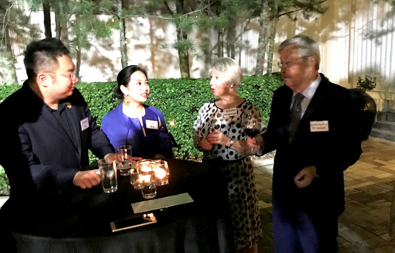 晚宴開始前,布蘭斯塔德致辭感謝在場所有對促進中美關(guān)系做出貢獻的工作人員和政企精英,并回顧了他與習主席友誼的淵源以及他與現(xiàn)任美國總統(tǒng)的友好關(guān)系。席間大使與夫人特地來到徐鵬桌上與其暢聊20多分鐘,回顧了雙方數(shù)次見面的友誼之旅,特別是2015年9月22日在習主席訪美的西雅圖站,時任艾奧瓦州長的布蘭斯塔德和加州州長顧問的徐鵬共聚省州長論壇,當時布蘭斯塔德攜帶了習主席早年在艾奧瓦州與他的合影老照片請習主席簽字留念,習主席收下了但沒有當場簽還。出人意料的是當晚的宴會上習主席帶來了簽署其姓名和日期并已經(jīng)裝裱好的老照片贈予布蘭斯塔德,令其感動萬分,這張珍貴的老照片被布蘭斯塔德隨身攜帶,擺放在了其大使官邸的會客廳中。這件事也深深觸動了徐鵬,使其對習主席的為人和其領(lǐng)導下的中國的前途充滿信心。