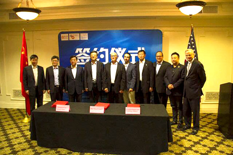 陳吉寧市長(左四)與Jim Wunderman(左五)、徐鵬(右二)以及Del Christensen(右三)出席簽約儀