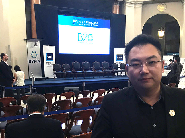 2018年3月7日上午,聯(lián)合國(guó)世界婦女節(jié)敲鐘儀式在阿根廷首都布宜諾斯艾利斯證交所舉行,美寶集團(tuán)總裁徐鵬應(yīng)邀出席本次活動(dòng)。這次活動(dòng)是由聯(lián)合國(guó)婦女組織(UN Women)和二十國(guó)集團(tuán)商業(yè)論壇(B20)主辦,在今年B20峰會(huì)主辦國(guó)阿根廷首都慶祝國(guó)際婦女節(jié),旨在借此提高對(duì)民間社會(huì)在促進(jìn)男女平等實(shí)現(xiàn)聯(lián)合國(guó)第五項(xiàng)可持續(xù)發(fā)展目標(biāo)中能起重要作用的認(rèn)識(shí)。