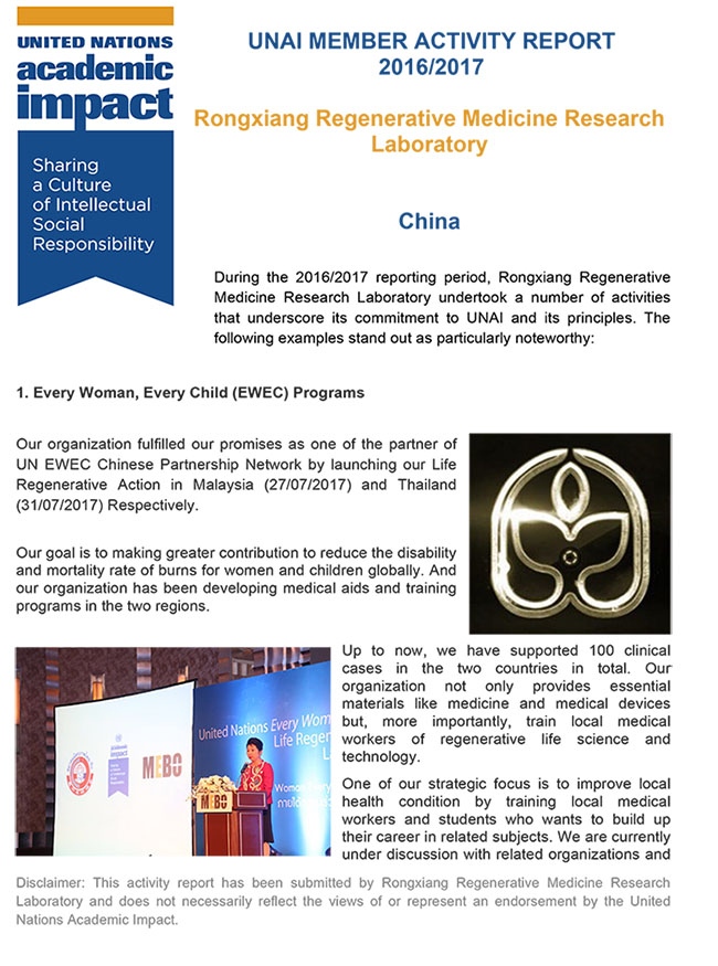 日前,“聯(lián)合國學(xué)術(shù)影響”組織特別公布其成員北京榮祥再生醫(yī)學(xué)研究所2016-2017年度承諾報告,特別展示了其發(fā)起的聯(lián)合國“每個婦女 每個兒童”中國合作伙伴網(wǎng)絡(luò)承諾,分別在馬來西亞(2017年7月27號)和泰國(2017年7月31號)開展的“生命再生行動”外,還對以燒傷濕潤暴露療法為核心進行的一帶一路倡議——“全球再生醫(yī)療技術(shù)研習(xí)班”進展也作為年度重要貢獻項目進行了特別公布。