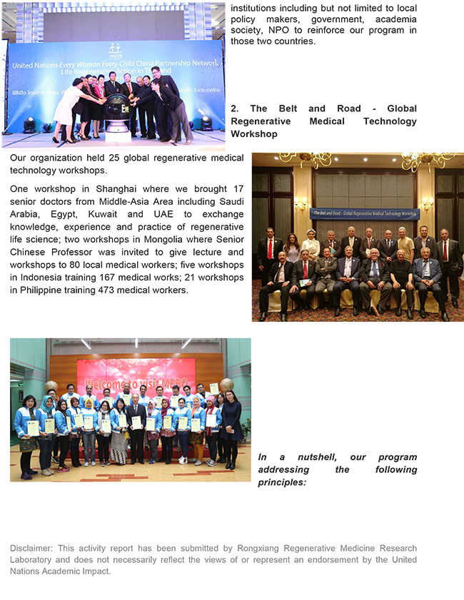 自2016年7月,北京榮祥再生醫(yī)學(xué)研究所成為“聯(lián)合國學(xué)術(shù)影響“成員來,致力于遵循聯(lián)合國學(xué)術(shù)影響“消除貧困、可持續(xù)發(fā)展、全民教育“等原則:對沙特、埃及、科威特、菲律賓、阿聯(lián)酋、印尼等醫(yī)務(wù)工作者進行培訓(xùn),2017年,共舉辦了25個“全球再生技術(shù)研習(xí)班”,總計約千名一帶一路沿線國家醫(yī)務(wù)工作者接受了培訓(xùn)。