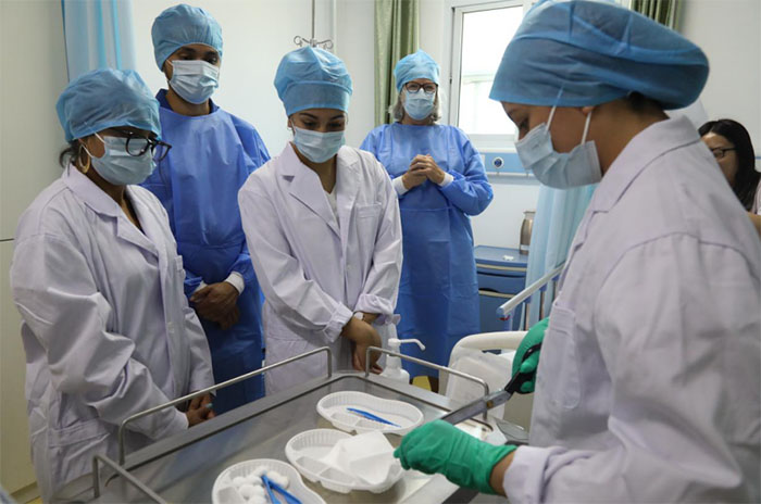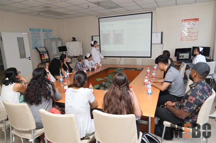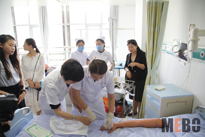 接著大家來到教室,與濱醫(yī)的學(xué)生一起學(xué)習(xí)了護(hù)理課程,中美老師代表分別進(jìn)行了授課。