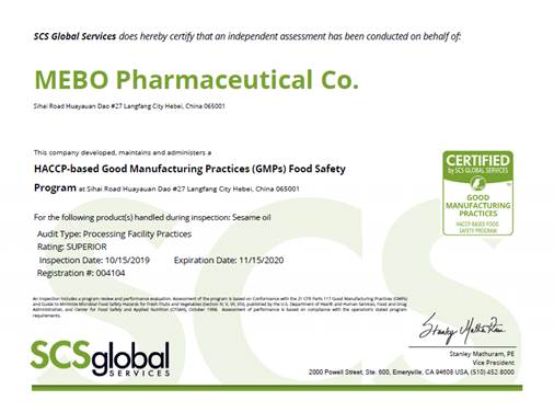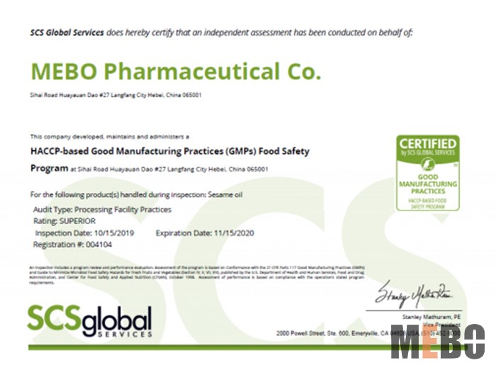 審核的結(jié)果再一次證明,廊坊美寶的芝麻油產(chǎn)品,優(yōu)質(zhì)、安全,值得信賴。廊坊美寶具備了符合國際標(biāo)準(zhǔn)的硬件水平,與世界先進(jìn)水平接軌的質(zhì)量管理水平和達(dá)到國際認(rèn)可的產(chǎn)品質(zhì)量,廊坊美寶制藥有限責(zé)任公司將在國際化的道路上繼續(xù)奮勇前進(jìn)。