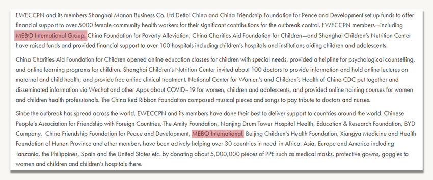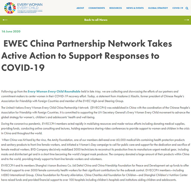 2020年6月16日,中國人民對外友好協(xié)會前會長、聯(lián)合國“每個婦女 每個兒童”高級指導委員會成員李小林署名文章《聯(lián)合國“每個婦女 每個兒童”中國合作伙伴網(wǎng)絡積極行動抗擊疫情》在聯(lián)合國“每個婦女 每個兒童“官網(wǎng)首頁刊登。文章指出中國伙伴網(wǎng)絡在新冠肺炎疫情期間,快速行動,充分發(fā)揮和匯聚各成員優(yōu)勢資源和力量,通過捐贈物資、募集善款、開設云課堂、召開經(jīng)驗分享視頻會議等多種形式助力中國和全球的婦女兒童抗擊疫情,其中特別提到了美寶集團在這次抗疫行動中的突出表現(xiàn)。