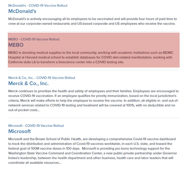新冠肺炎疫情期間,MEBO不僅向當?shù)厣鐓^(qū)捐贈醫(yī)療用品,與哈佛大學醫(yī)學院等學術機構合作建立新冠肺炎皮膚相關表現(xiàn)數(shù)據(jù)庫,還將加州州立大學洛杉磯分校(Cal state LA)徐榮祥生物科學創(chuàng)新中心設定為新冠肺炎免費檢測中心。
