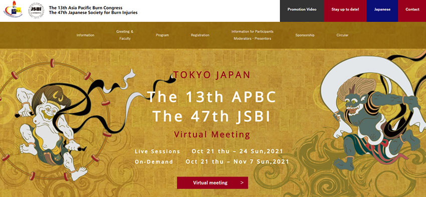 2021年10月21日至10月24日,第13屆亞太燒傷會(huì)議(APBC 2021)暨日本燒傷學(xué)會(huì)(JSBI)第47屆年會(huì)以虛擬會(huì)議的形式舉行。亞太燒傷會(huì)議是國際燒傷會(huì)議日歷上的一項(xiàng)重要活動(dòng),它匯聚了來自各國的醫(yī)生、護(hù)士及科研人員等,為全球醫(yī)務(wù)工作者分享臨床治療經(jīng)驗(yàn)、最新研究成果和臨床管理方法提供了一個(gè)寶貴的平臺(tái)。本屆大會(huì)的主題為“燒傷治療的下一次動(dòng)態(tài)變化——應(yīng)對感染、預(yù)防和控制感染”(The Next Dynamic Change in Burn Care – Coping with Infection, Infection Prevention and Control)。