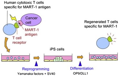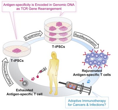 研究團隊使用的技術引用了已知的因子(山中申彌使用的因子)將成熟的免疫T細胞轉化為iPSCs。然后擴增這些iPSCs并使他們重新分化為T細胞。新生成的T細胞被還原(rejuvenate)后生長潛能提高、壽命延長,且仍然具有最初的識別癌癥和艾滋病感染靶細胞的能力。這意味著用iPSCs技術調控T細胞可能幫助將來建立更有效的免疫療法。