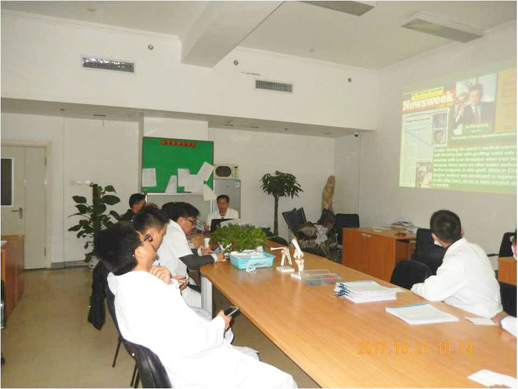 陳主任在示教室向來賓詳細介紹了運用燒傷創(chuàng)瘍再生醫(yī)療技術(shù)如何換藥,并指出它是不同于傳統(tǒng)的外科換藥,把換藥做到了極致。換藥時要掌握三不原則,即不疼痛、不出血、不干燥。到訪者表示受益匪淺。