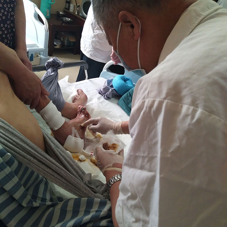 5月21日下午,北京榮祥再生醫(yī)學(xué)研究所副所長(zhǎng)、中國(guó)中西醫(yī)結(jié)合學(xué)會(huì)燒傷專(zhuān)業(yè)委員會(huì)常務(wù)委員、《燒傷創(chuàng)瘍雜志》副總編輯、應(yīng)用燒傷創(chuàng)瘍?cè)偕t(yī)療技術(shù)治療糖尿病足領(lǐng)域?qū)<?、研究員王洪生教授應(yīng)邀前往廣東省四會(huì)市萬(wàn)隆醫(yī)院會(huì)診6例病人,其中一例燒傷病人達(dá)40%、三度燒傷達(dá)10%的重度燒傷,王教授指導(dǎo)并帶領(lǐng)全科主任醫(yī)生護(hù)理共6人在病房換藥,并在此過(guò)程中糾正一些不規(guī)范的換藥事項(xiàng),效果明顯。