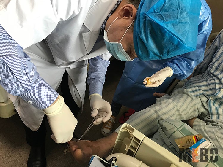 10月28日,北京榮祥再生醫(yī)學(xué)研究所副所長(zhǎng)、中國(guó)中西醫(yī)結(jié)合學(xué)會(huì)燒傷專業(yè)委員會(huì)常務(wù)委員、《燒傷創(chuàng)瘍雜志》副總編輯、應(yīng)用燒傷創(chuàng)瘍?cè)偕t(yī)療技術(shù)治療糖尿病足領(lǐng)域?qū)<?、研究員王洪生教授應(yīng)邀來到佛山市南海區(qū)人民醫(yī)院燒傷整形科會(huì)診一例40%燒傷患者,并應(yīng)邀指導(dǎo)該科8例燒傷、糖足、大壓瘡患者換藥,臨床幫帶效果明顯。