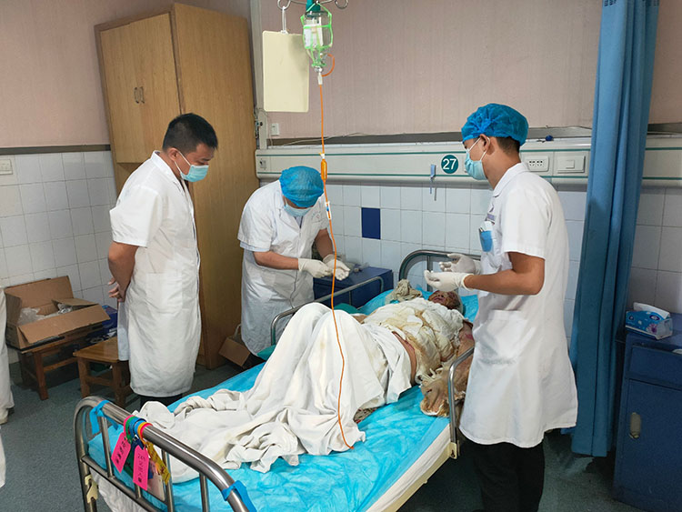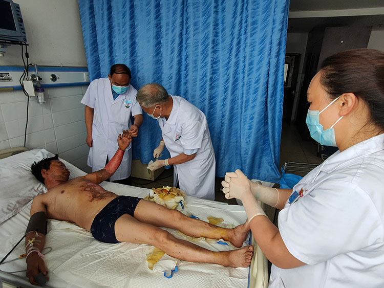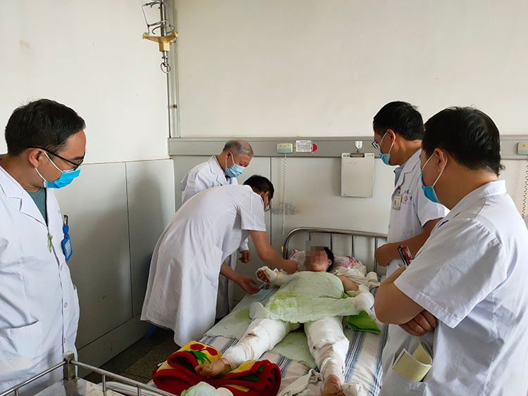13日,金教授來到洛陽第十人民醫(yī)院創(chuàng)面修復(fù)科,對科室收治的糖尿病液化氣爆炸傷病人進(jìn)行查房換藥,對科室的燒傷治療效果給予肯定。