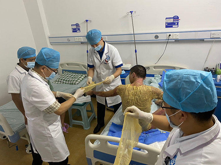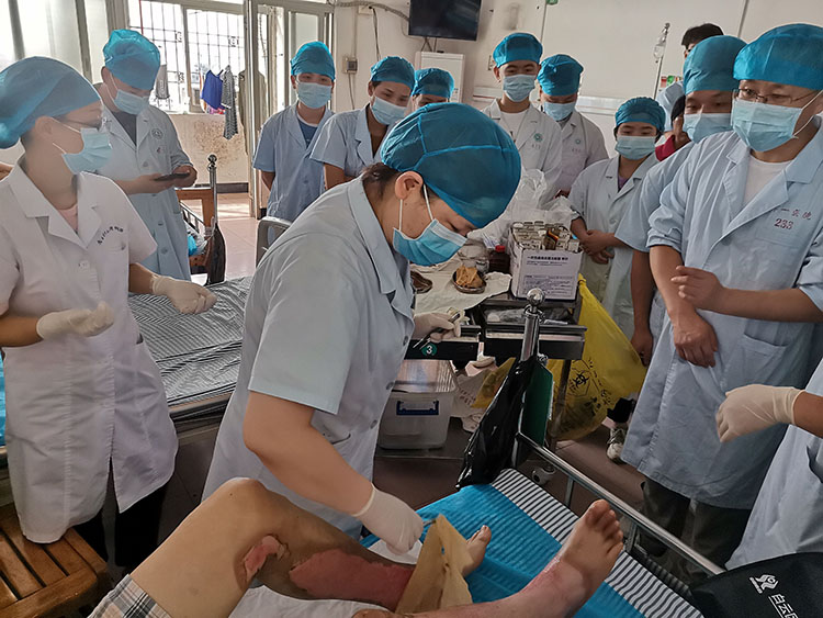 9月1日,北京榮祥再生醫(yī)學(xué)研究所副所長、中國中西醫(yī)結(jié)合學(xué)會燒傷專業(yè)委員會常務(wù)委員、《燒傷創(chuàng)瘍雜志》副總編輯、應(yīng)用燒傷創(chuàng)瘍再生醫(yī)療技術(shù)治療糖尿病足領(lǐng)域?qū)<?、研究員王洪生主任應(yīng)邀來到廣東省四會市慈航醫(yī)院、肇慶市仁愛手外科醫(yī)院分別會診兩例大燒傷面積病人。王教授親自到病房示范清創(chuàng)與換藥,進行臨床教學(xué),受到醫(yī)院領(lǐng)導(dǎo)及各醫(yī)護人員和患者家屬的高度贊揚認可!