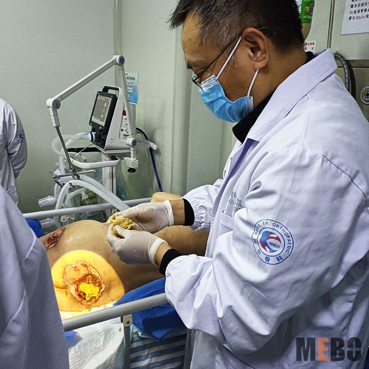 培訓(xùn)結(jié)束后,方教授指導(dǎo)醫(yī)護(hù)人員為多發(fā)壓瘡4期病人清創(chuàng),應(yīng)用再生醫(yī)療技術(shù)及濕潤(rùn)燒傷膏做油紗換藥治療。