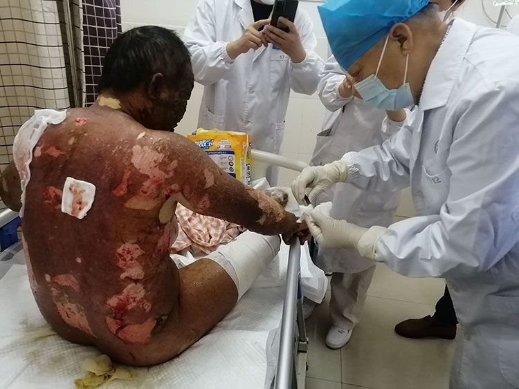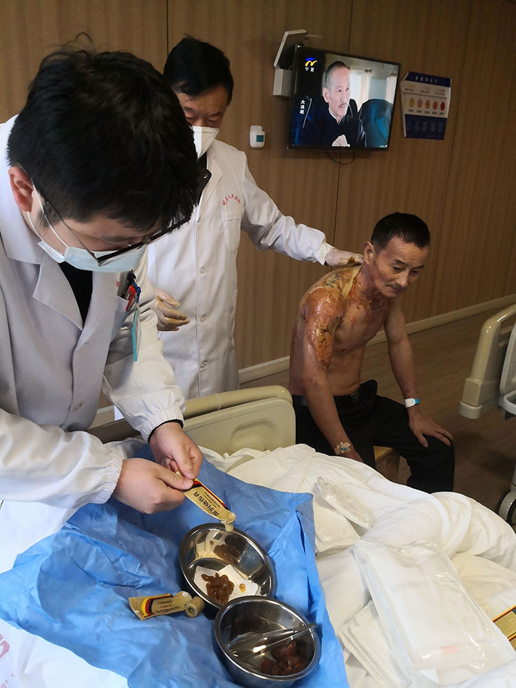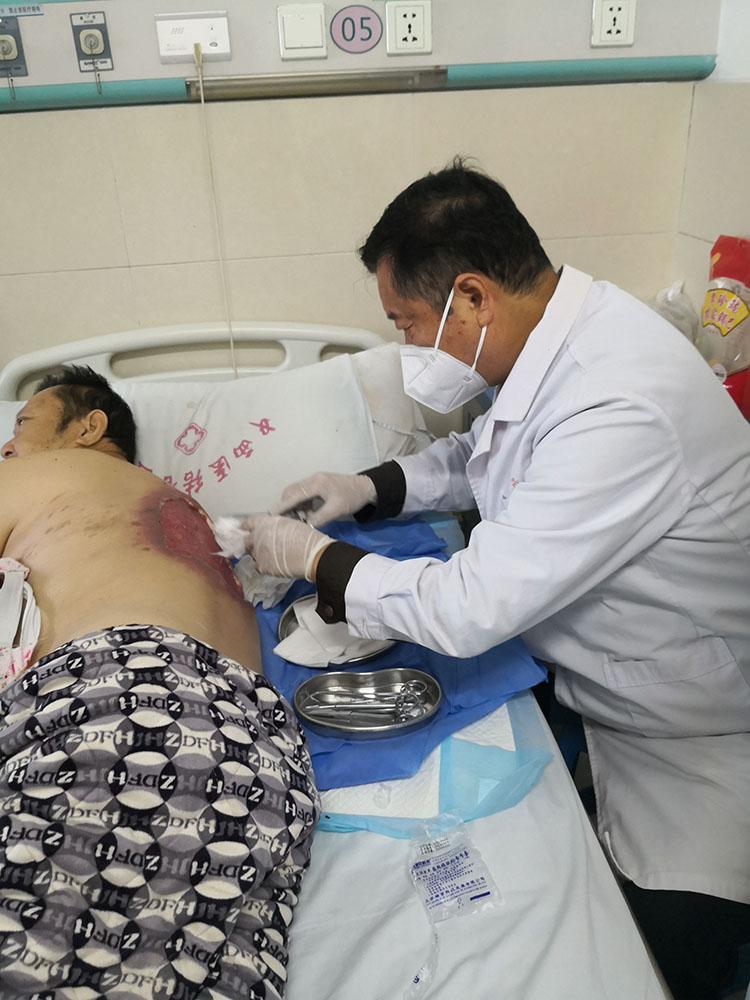 2022年11月22日,中國(guó)中西醫(yī)結(jié)合學(xué)會(huì)燒傷專(zhuān)業(yè)委員會(huì)醫(yī)療部張強(qiáng)主任應(yīng)邀前往滁州市中西醫(yī)結(jié)合醫(yī)院和安徽涵博健康集團(tuán)醫(yī)院,對(duì)一例背部巨大潰瘍患者和一例燒傷患者進(jìn)行會(huì)診,現(xiàn)場(chǎng)講解指導(dǎo)應(yīng)用再生醫(yī)療技術(shù)處理創(chuàng)面及換藥方法,并就2例患者后期的治療與主管醫(yī)生進(jìn)行了交流。