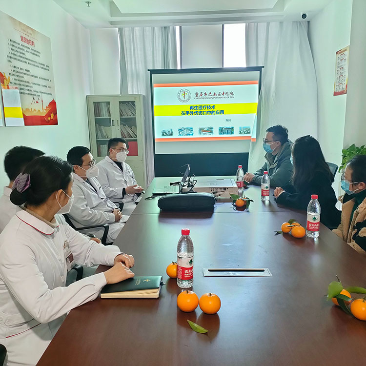 1月6日, 重慶市南岸區(qū)古醫(yī)院林順朝主任帶領(lǐng)科室羅醫(yī)生到九龍坡區(qū)第二人民醫(yī)院創(chuàng)瘍中心科室參觀學(xué)習(xí),會(huì)上張孝平主任進(jìn)行了科室收治的一些案例分享,林主任對(duì)再生醫(yī)療技術(shù)的神奇療效表示贊嘆,并在聽到張主任的技術(shù)分享后提高了后續(xù)對(duì)病人的治療信心。之后去病房觀看了燙傷和頸墉病人的現(xiàn)場(chǎng)換藥等,對(duì)再生醫(yī)療技術(shù)有了新的認(rèn)識(shí)。