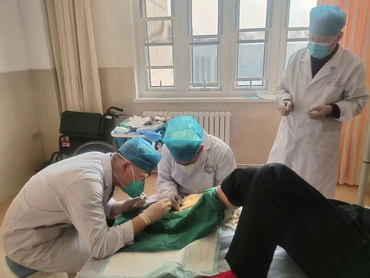 2023年1月12日,北京宣武中醫(yī)醫(yī)院外科張勇主任應(yīng)內(nèi)蒙古托克托縣醫(yī)院外科郝主任的邀請(qǐng),對(duì)一例糖尿病足潰瘍創(chuàng)面的患者進(jìn)行了微粒皮種植手術(shù),并就如何換藥進(jìn)行了規(guī)范操作,之后做了科室培訓(xùn),這次會(huì)診得到了郝主任和患者的一致好評(píng)。