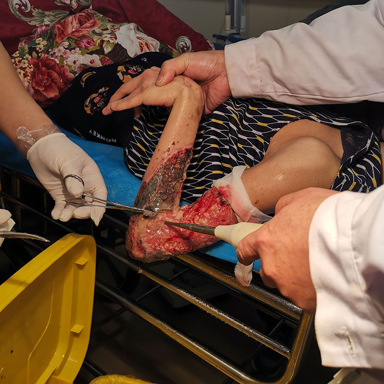 2月28日,應(yīng)陽(yáng)江市陽(yáng)東區(qū)人民醫(yī)院骨二科李主任和梁主任邀請(qǐng),北京榮祥再生醫(yī)學(xué)研究所副所長(zhǎng)、中國(guó)中西醫(yī)結(jié)合學(xué)會(huì)燒傷專業(yè)委員會(huì)常務(wù)委員、《中國(guó)燒傷創(chuàng)瘍雜志》副總編輯、應(yīng)用燒傷創(chuàng)瘍?cè)偕t(yī)療技術(shù)治療糖尿病足領(lǐng)域?qū)<彝鹾樯魅螒?yīng)邀到該科室指導(dǎo)創(chuàng)面修復(fù)??平ㄔO(shè)及會(huì)診糖尿足潰瘍和壓瘡等慢性創(chuàng)面病人,并到手術(shù)室親自為三例慢性創(chuàng)面病人清創(chuàng)、換藥,指導(dǎo)創(chuàng)瘍?cè)偕t(yī)療技術(shù)規(guī)范化應(yīng)用,得到醫(yī)護(hù)人員和患者的高度好評(píng)。