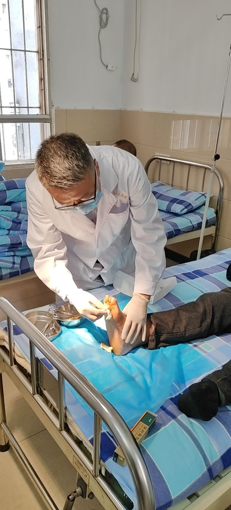 4月6日,北京榮祥再生醫(yī)學(xué)研究所副所長、中國中西醫(yī)結(jié)合學(xué)會(huì)燒傷專業(yè)委員會(huì)常務(wù)委員、《中國燒傷創(chuàng)瘍雜志》副總編輯、應(yīng)用燒傷創(chuàng)瘍?cè)偕t(yī)療技術(shù)治療糖尿病足領(lǐng)域?qū)<彝鹾樯魅螒?yīng)揭西縣第二人民醫(yī)院外一科邀請(qǐng),蒞臨科里會(huì)診一例高齡偏癱康復(fù)期壓瘡患者,并示范規(guī)范換藥流程!之后給科里醫(yī)護(hù)人員授課再生醫(yī)療技術(shù)在慢性創(chuàng)面壓瘡、糖足的治療新進(jìn)展,得到醫(yī)護(hù)人員的高度認(rèn)可,取得了良好的效果!