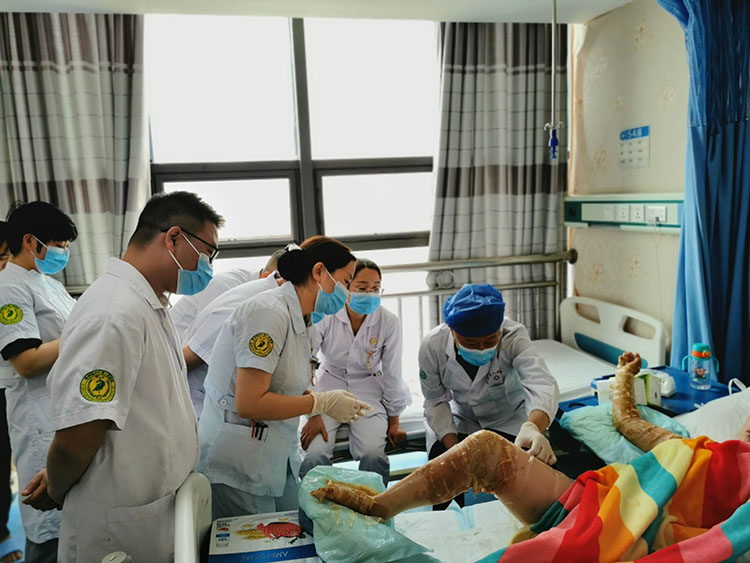 2023年4月20日,北京榮祥再生醫(yī)學(xué)研究所副所長、《中國燒傷創(chuàng)瘍雜志》編委金黨軍應(yīng)江西贛州石城縣人民醫(yī)院泌外燒燒傷科李主任的邀請,來到醫(yī)院會診一例大面積燒傷病人,并同陳醫(yī)生和黃醫(yī)生一起對大面積燒傷患者運用再生醫(yī)療技術(shù)規(guī)范換藥且針對大面積燒傷患者的救治進行了詳細的交流探討,獲得醫(yī)生和患者家屬的一致好評和認可。下午應(yīng)寧都縣城北醫(yī)院曾院長的邀請,來到該院就再生醫(yī)療技術(shù)在臨床上各種慢性創(chuàng)面中的應(yīng)用進行了全院的技術(shù)培訓(xùn)。