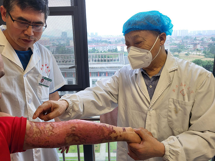5月12日,中國中西醫(yī)結合學會燒傷專業(yè)委員會醫(yī)療部張強主任,受邀到訪武漢大學人民醫(yī)院經開醫(yī)院中醫(yī)瘡瘍科會診壓瘡、下肢靜脈曲張血管性潰瘍、低溫燙傷等慢創(chuàng)患者,張主任示范了再生醫(yī)療技術規(guī)范清創(chuàng)、換藥及處理創(chuàng)面的技巧與細節(jié),會后同科室張成主任探討了患者的基礎病的治療與營養(yǎng)方案,針對不同的病情制定個性化治療方案。此次會診交流活動,促進了中醫(yī)藥傳承創(chuàng)新,提升了中醫(yī)藥在治療瘡瘍科疾病中的作用!