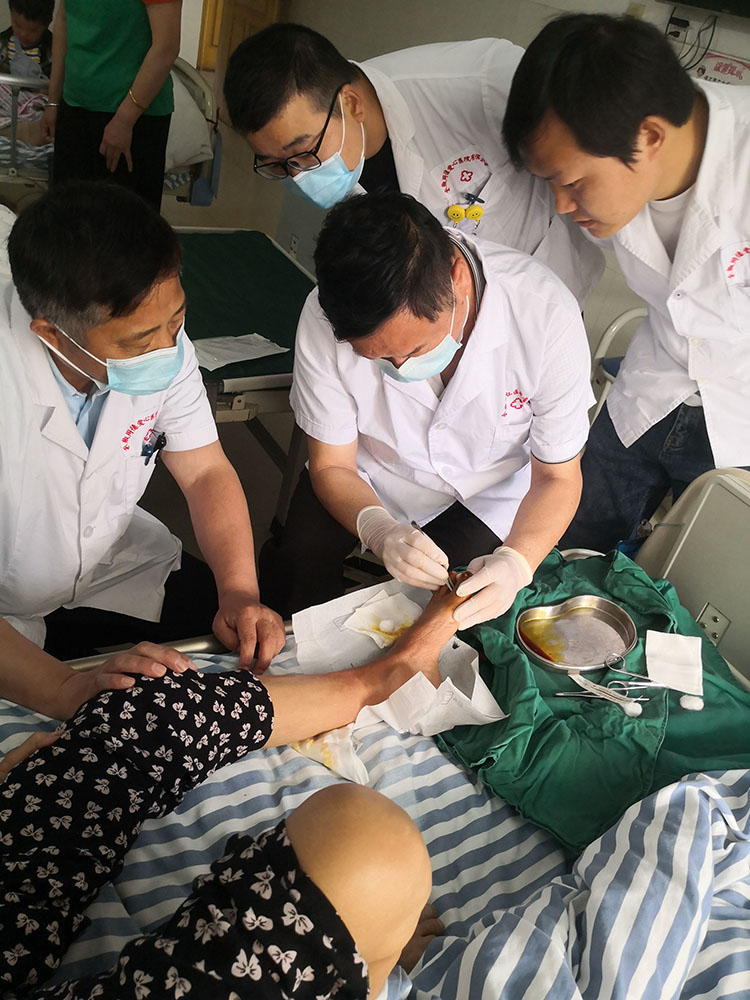 2023年5月19日,中國中西醫(yī)結合學會燒傷專業(yè)委員會醫(yī)療部張主任應邀前往全椒縣同德愛心醫(yī)院,會診一例糖尿病足患者和一例褥瘡患者,張主任親自對創(chuàng)面進行清創(chuàng),講解應用再生醫(yī)療技術處理創(chuàng)面及換藥方法。會診結束后和醫(yī)生進行了病情分析及治療方案的制定。