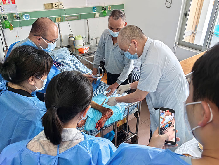 2023年7月4日,重慶長(zhǎng)壽區(qū)中醫(yī)院一例老年患者因艾灸治療不慎被燙傷,應(yīng)科室陳主任邀請(qǐng),享受國(guó)務(wù)院特殊津貼專家、中國(guó)中西醫(yī)結(jié)合燒傷專業(yè)委員會(huì)顧問、中國(guó)研究型醫(yī)院學(xué)會(huì)創(chuàng)面防治與損傷組織修復(fù)專業(yè)委員會(huì)委員、《中國(guó)燒傷創(chuàng)瘍雜志》常務(wù)編委、成都市郫都區(qū)人民醫(yī)院燒傷創(chuàng)瘍科學(xué)術(shù)帶頭人付子俊教授,前往醫(yī)院會(huì)診,付教授問詢了患者受傷的情況,跟科室醫(yī)護(hù)人員一起交流了再生醫(yī)療技術(shù)臨床換藥的要點(diǎn),然后到病房親自換藥指導(dǎo)如何清除壞死組織,換藥后進(jìn)行了臨床交流。