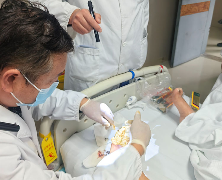2025年10月30日,《中國燒傷創(chuàng)瘍雜志》編委、燒傷創(chuàng)瘍再生醫(yī)療技術(shù)臨床專家張強主任應(yīng)邀前往定遠縣總醫(yī)院創(chuàng)面修復(fù)科,會診多例糖足和創(chuàng)面患者。張主任深入病房指導(dǎo)并示范再生醫(yī)療技術(shù)規(guī)范化臨床應(yīng)用,結(jié)合患者病情制定后續(xù)治療方案,受到醫(yī)護人員高度贊賞。