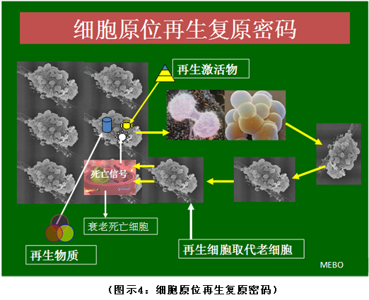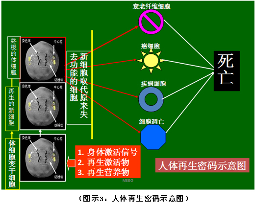 首先復(fù)習(xí)一下第一個(gè)生命之謎(詳見圖示3)?!捌平馊梭w生命延續(xù)之謎”我們?cè)?002年就已經(jīng)公布了,秘密在于當(dāng)人體細(xì)胞在開始走向衰老、癌變、疾病、凋亡這四個(gè)路線的時(shí)候,其臨近的再生潛能細(xì)胞可以在再生物質(zhì)的作用下被激活并發(fā)揮其細(xì)胞自身的再生潛能,從而再生出新的細(xì)胞取代原來失去功能的細(xì)胞,這是人體再生復(fù)原的密碼和機(jī)理,它早已在斷指、燒傷、創(chuàng)傷、胃腸粘膜損傷等多個(gè)領(lǐng)域得以應(yīng)用并獲得成功。在人體再生復(fù)原程序公布以后,世界生命科學(xué)的研究方向都開始逐步調(diào)整到這個(gè)方向上來,而我們則已經(jīng)開始人體應(yīng)用了,并且根據(jù)實(shí)現(xiàn)的結(jié)果、總結(jié)的規(guī)律證明了再生科學(xué)的真實(shí)性,就跟破案一樣,根據(jù)結(jié)果逐步推理得出事實(shí),而很多生命科學(xué)的研究者還處于探究之路上,所以說我們是完成者的秘密,他們是探索者的小結(jié)。
