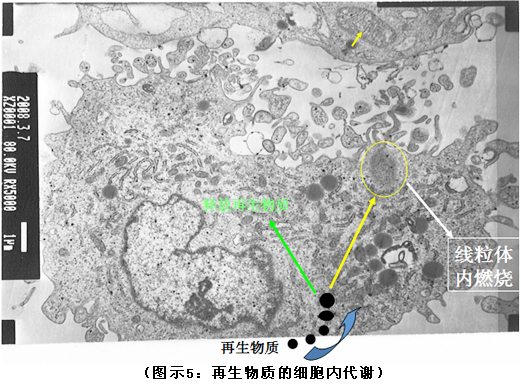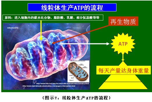 線粒體的膜有很多功能,會(huì)產(chǎn)生各種酶,酶可以把大自然的能量變成身體的能量,大自然的物質(zhì)變成身體的物質(zhì),我們的再生物質(zhì)進(jìn)入人體大部分成分就變成ATP了(部分物質(zhì)分離出來,以后會(huì)講到),人體會(huì)發(fā)熱但是不會(huì)長(zhǎng)胖,都變成能量釋放出來了(詳見圖示7)。比如四川地震時(shí)有的被埋幾天的老年人身體極度虛弱,服用再生物質(zhì)后則能很快下床活動(dòng)了等等。