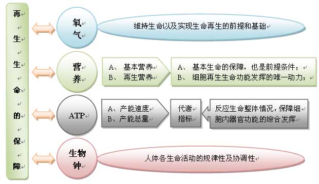 既往我們已經(jīng)知道“氧氣、營(yíng)養(yǎng)、ATP、生物鐘”是駕馭人體再生生命的四大指標(biāo),也是臨床再生技術(shù)的操作指標(biāo)及人體生命活動(dòng)的觀察指標(biāo),它們與人體再生生命之間的關(guān)系究竟是怎樣的?如下圖所示。