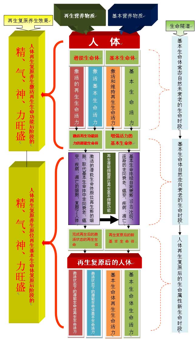 “生命體”、“生命環(huán)境”以及“再生營(yíng)養(yǎng)”是人體再生復(fù)原的技術(shù)實(shí)施前提和基礎(chǔ),結(jié)合運(yùn)用“再生復(fù)原技術(shù)”便可以實(shí)現(xiàn)人體生命的“精、氣、神、力”持續(xù)旺盛。其中,“再生營(yíng)養(yǎng)”是人體再生復(fù)原科學(xué)核心技術(shù)中最重要的組成部分,研究表明,它具備四大功能,第一,啟動(dòng)并喚醒人體“潛能生命體”的生命功能,使其發(fā)揮基本生命體的生命功能,保障和加強(qiáng)人體基本生命功能的力量;第二,激活并啟動(dòng)人體“潛能生命體”的再生基本生命體的程序,即當(dāng)“基本生命體”中的細(xì)胞出現(xiàn)衰老、癌變、凋亡、嚴(yán)重疾病這四大死亡程序時(shí),“潛能生命體”可以原位再生一個(gè)新的基本生命體,替換(或補(bǔ)充)原來(lái)器官組織中因四大死亡程序而導(dǎo)致的基本生命體缺如,從而實(shí)現(xiàn)基本生命體的結(jié)構(gòu)完整、生命功能正常;第三、激活“基本生命體”的“再生生命活力”;第四,激活“潛能生命體”的“再生生命活力”。人體再生復(fù)原的核心就是利用“再生營(yíng)養(yǎng)”的這四大功能,在保障人體“基本生命”的同時(shí)實(shí)現(xiàn)了人體的“再生生命”及“再生基本生命體”的功能,“潛能生命體”原位再生復(fù)原組織器官的結(jié)構(gòu)、保障和加強(qiáng)組織器官功能的同時(shí),人體原來(lái)未發(fā)揮功能的細(xì)胞都參與到了機(jī)體的一線(xiàn)工作當(dāng)中,兩者共同作用實(shí)現(xiàn)了超越常規(guī)健康的人體整體生命活力旺盛的表達(dá),即“精、氣、神、力”旺盛。