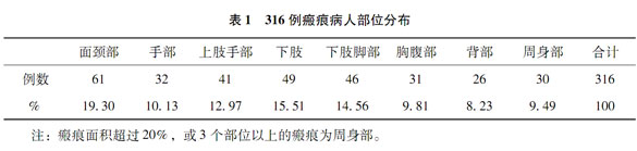 316例病人全部為深Ⅱ度以上燒傷病人,其中男性206人,占65.19%,女性110人,占34.81%,3個(gè)月內(nèi)的預(yù)防性應(yīng)用154例,占48.73%。預(yù)防兼治療性應(yīng)用162例,占51.17%,按預(yù)先設(shè)計(jì)的治療方法和療效評(píng)定標(biāo)準(zhǔn)評(píng)定,全部在右效范圍,右效率100%。治療部位見(jiàn)表1。