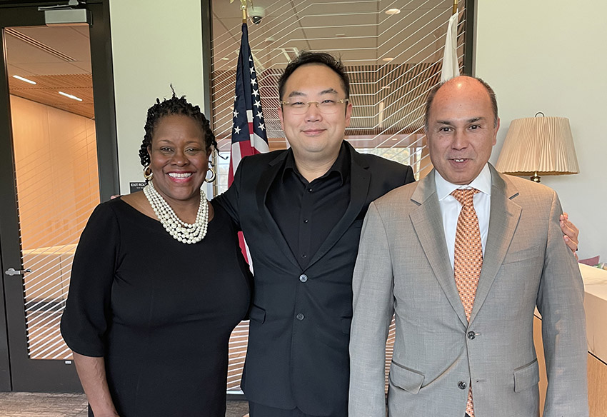近日,美寶集團(tuán)董事局主席徐鵬與加州州立大學(xué)洛杉磯分校(洛杉磯州大)新任校長(zhǎng)Berenecea Johnson Eanes博士及副校長(zhǎng)Robert Avalos會(huì)晤,就大學(xué)合作等具體事宜展開(kāi)進(jìn)一步討論。Berenecea Johnson Eanes博士是加州州立大學(xué)洛杉磯分校新任校長(zhǎng),也是該校首位女校長(zhǎng)。此前,徐鵬曾應(yīng)邀訪問(wèn)該校,與時(shí)任代校長(zhǎng) Leroy Morishita等會(huì)晤。