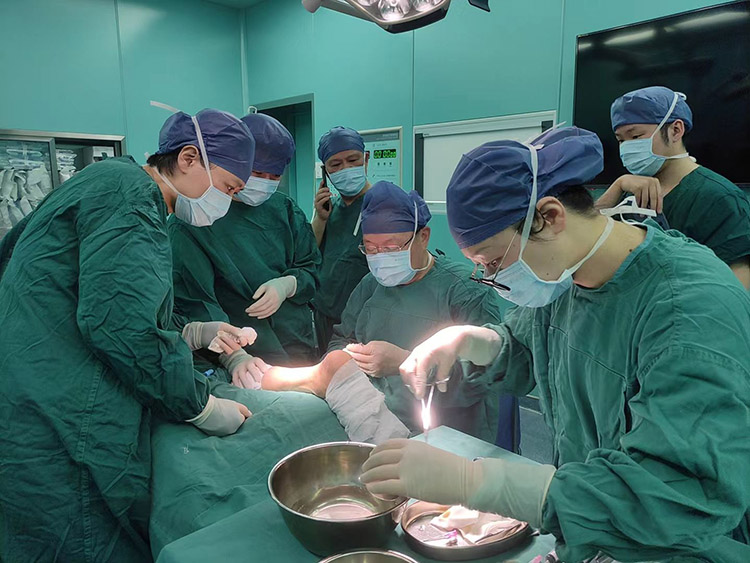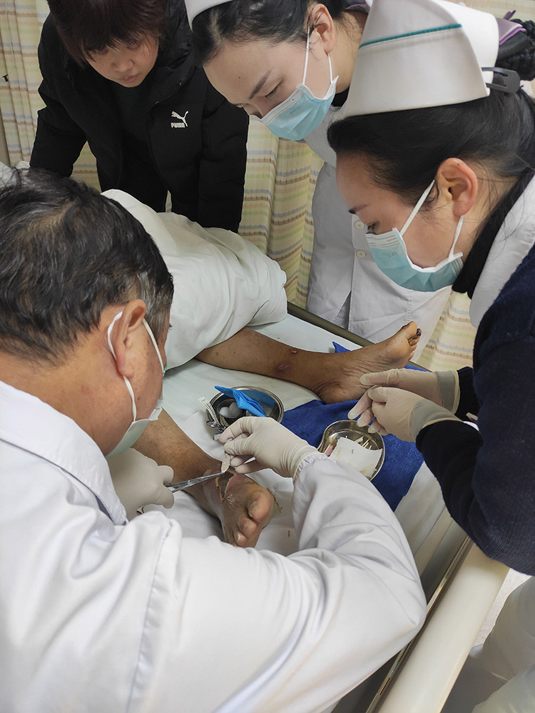 1月29日,《中國(guó)燒傷創(chuàng)瘍雜志》常務(wù)編委、燒傷創(chuàng)瘍?cè)偕t(yī)療技術(shù)臨床專家趙瑞慶教授,應(yīng)通州區(qū)第三人民醫(yī)院的再次邀請(qǐng),運(yùn)用再生醫(yī)療技術(shù)分別會(huì)診了四級(jí)糖尿病足潰瘍患者和長(zhǎng)期服用抗凝藥物,摔傷后致右下肢脛前皮膚破潰感染的患者。事后與當(dāng)?shù)蒯t(yī)務(wù)人員詳細(xì)制定進(jìn)一步治療計(jì)劃,糖足潰瘍患者聽到右足能夠保住的喜訊,流下了感激的淚水。