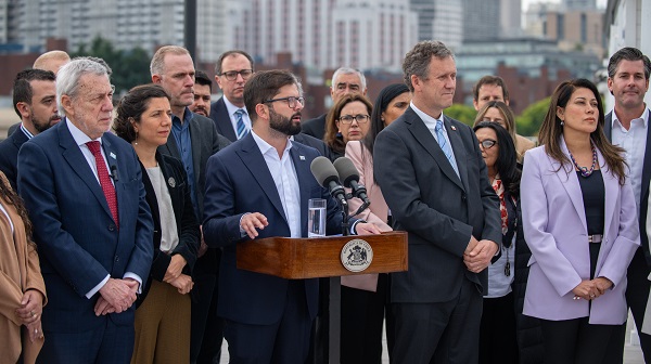 智利總統(tǒng)加夫列爾·博里奇在灣區(qū)委員會(huì)克拉馬斯號頂層“美寶花園”發(fā)表演講