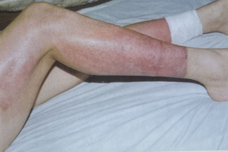 2. 眼觀表現(xiàn):局部紅腫明顯,起水皰、壁薄,內(nèi)含淡黃色血漿樣液體,劇痛;水皰破后創(chuàng)面可見潮紅、濕潤,質(zhì)地較軟,溫度較高。