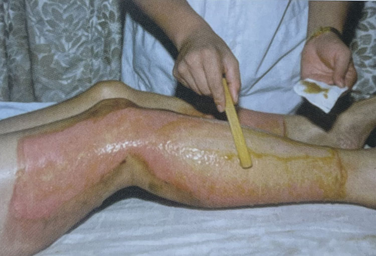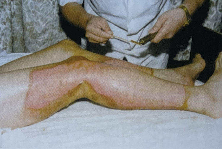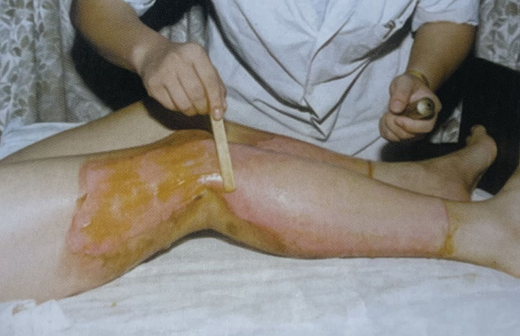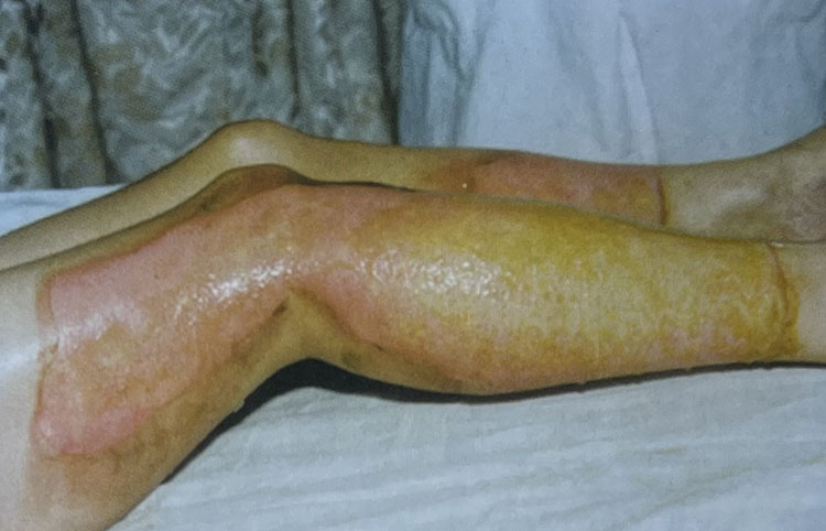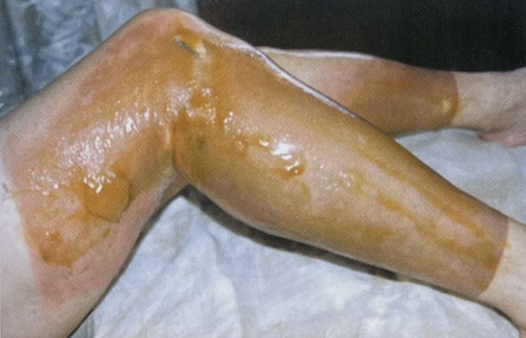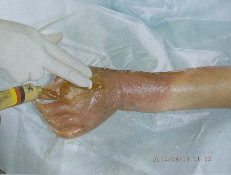 2. 有些傷員來診時皰皮已經(jīng)擦掉脫落,可以見到創(chuàng)面充血紅潤呈鮮紅色,仔細觀察可見高度充血的密集血管網(wǎng)形成,同時由于皮下豐富的神經(jīng)末梢活性尚存,所以創(chuàng)面疼痛較明顯。在外涂MEBO保護創(chuàng)面后疼痛明顯減輕,同時創(chuàng)面豐富的毛細血管網(wǎng)也在生理濕潤環(huán)境的保護下保持通暢,維持生理功能。