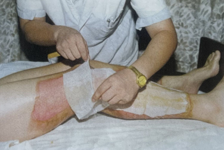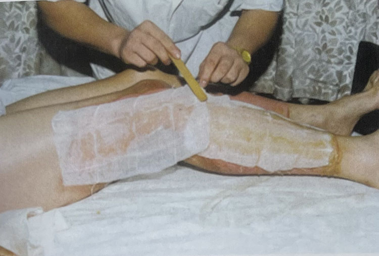 圖 2-5-7 傷后立即將 MEBO 涂于創(chuàng)面 1mm厚(12小時內(nèi)用藥效果最佳)。