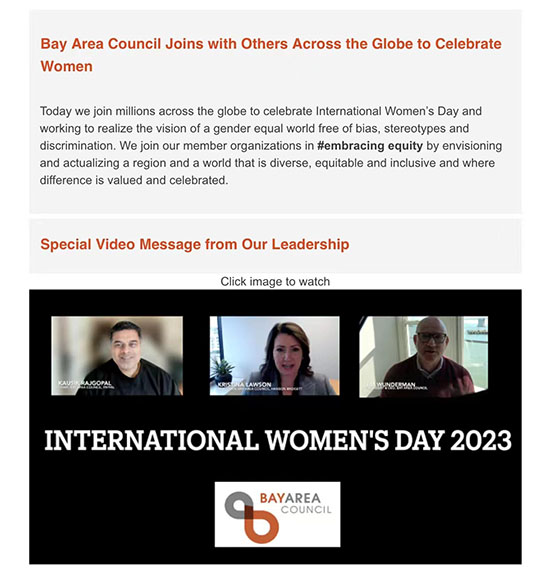 2023年3月8日,國(guó)際勞動(dòng)?jì)D女節(jié),舊金山灣區(qū)委員會(huì)(Bay Area Council)特意舉辦慶祝活動(dòng),邀請(qǐng)其成員組織共同“擁抱公平”,接受并尊重差異,為實(shí)現(xiàn)一個(gè)沒有偏見、陳規(guī)成見和歧視的性別平等世界的愿景而努力,以期構(gòu)建一個(gè)多元化、公平和包容的地區(qū)和世界。