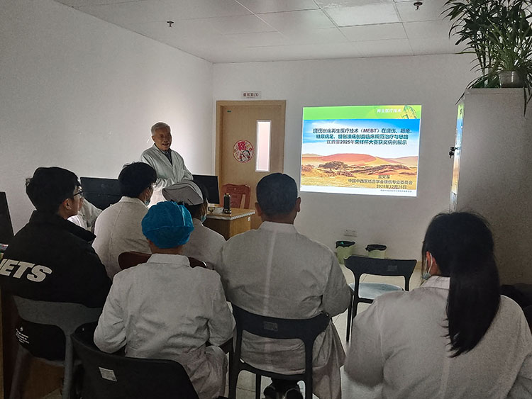 1月15日,應(yīng)信豐縣中醫(yī)院手足創(chuàng)面修復(fù)外科黃主任邀請(qǐng),北京榮祥再生醫(yī)學(xué)研究所副所長(zhǎng)、《中國(guó)燒傷創(chuàng)瘍雜志》編委、燒傷創(chuàng)瘍?cè)偕t(yī)療技術(shù)臨床專家金黨軍主任來(lái)到該院,為醫(yī)護(hù)人員培訓(xùn)再生醫(yī)療技術(shù)在燒傷、壓瘡、糖尿病足、慢性潰瘍等慢性創(chuàng)面臨床上的規(guī)范使用,并展示了2025年江西地區(qū)湘贛第七屆“榮祥杯”優(yōu)秀病例。培訓(xùn)結(jié)束后,金主任與醫(yī)護(hù)人員一起為多例慢創(chuàng)患者會(huì)診并親自示范規(guī)范換藥,就后續(xù)治療與經(jīng)管醫(yī)生深入交流并提出指導(dǎo)意見,贏得在場(chǎng)患者家屬和醫(yī)護(hù)人員的一致好評(píng)。會(huì)診結(jié)束后,金主任還與黃主任就科室建設(shè)與發(fā)展進(jìn)行了深入交流。下午,金主任前往信豐縣人民醫(yī)院胸外創(chuàng)面修復(fù)科,與何醫(yī)生負(fù)責(zé)的慢創(chuàng)病例進(jìn)行交流并提出后續(xù)治療指導(dǎo)意見。
